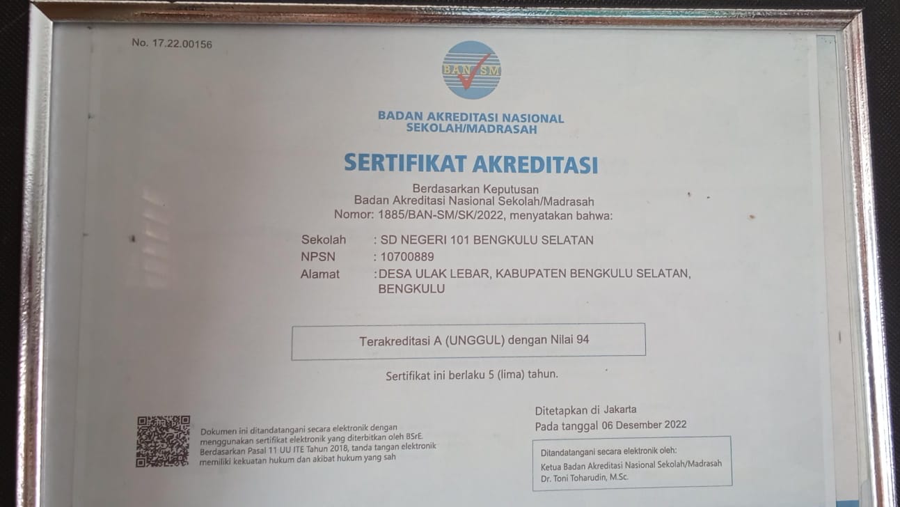Berdasarkan Keputusan Badan Akreditasi Nasional Sekolah/ Madrasah nomor : 1885/BAN-SM/SK/2022, Ditetapkan bahwa SDN 101 Bengkulu Selatan Terakreditasi A (Unggul).